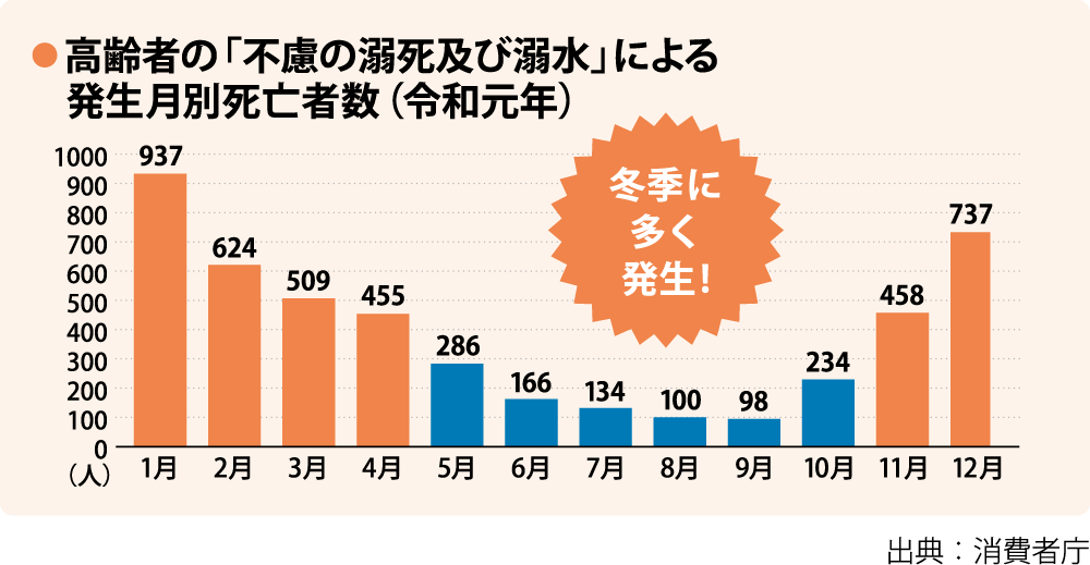 溺死を含む入浴中の事故死は、特に冬季(12月〜2月)に、年間発生件数の約半数が集中します。これは、暖かい部屋から寒い脱衣所への移動によって血圧が急変する、いわゆる「ヒートショック」が主な引き金となっていることを示しています。